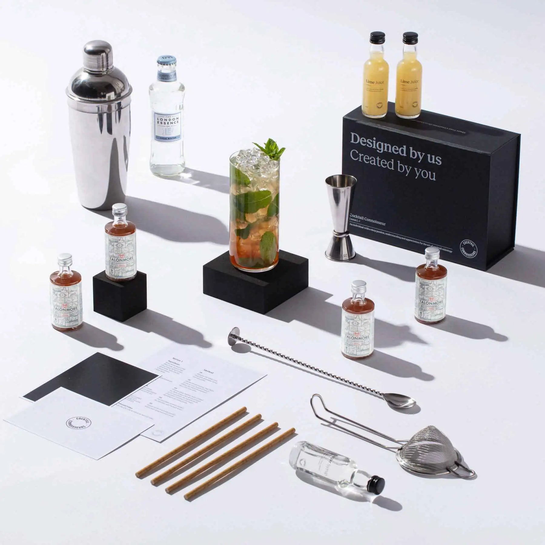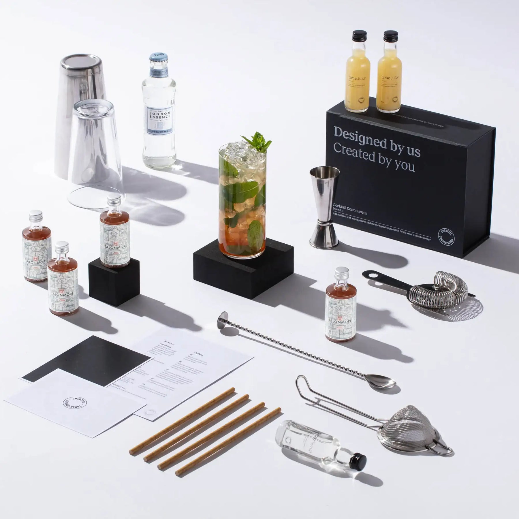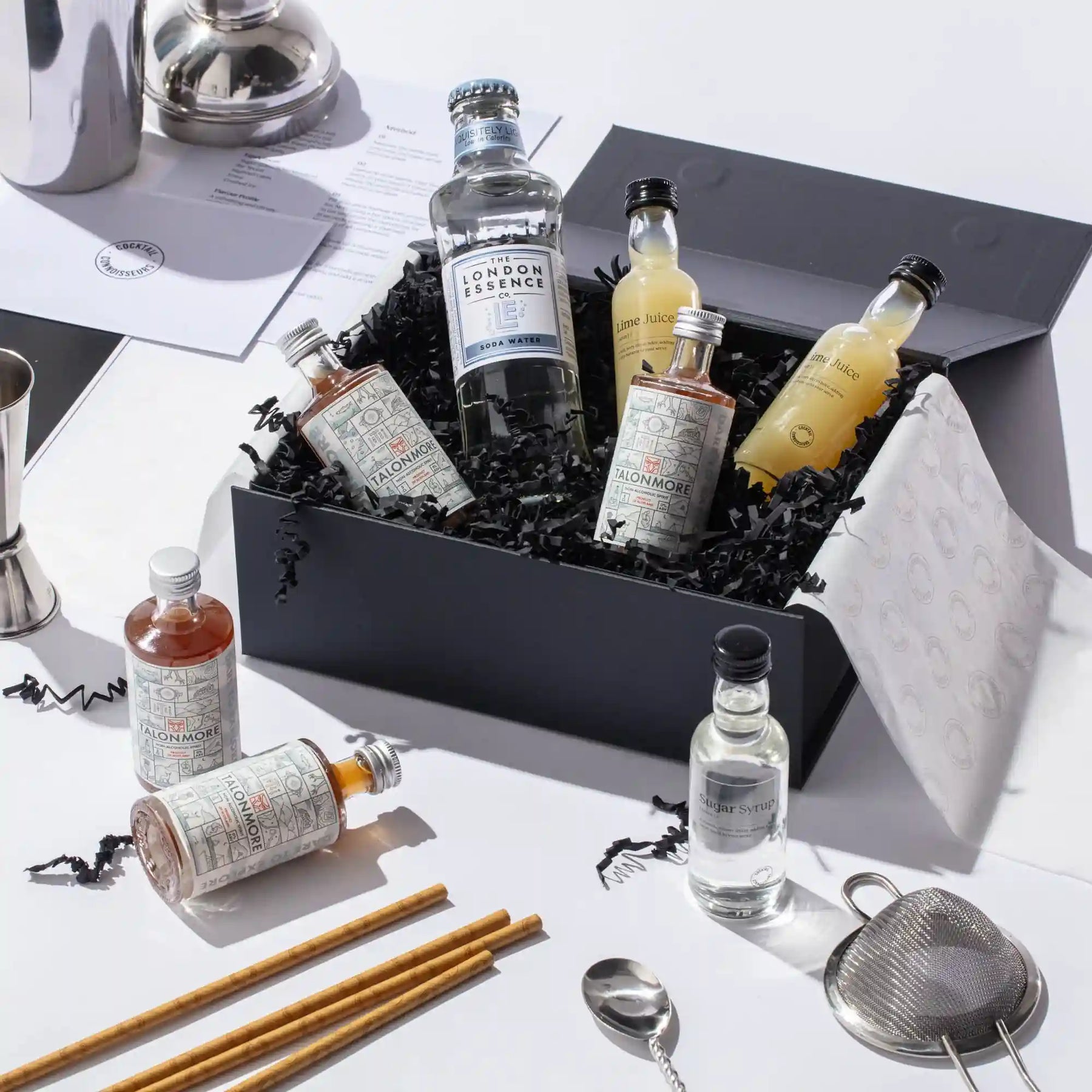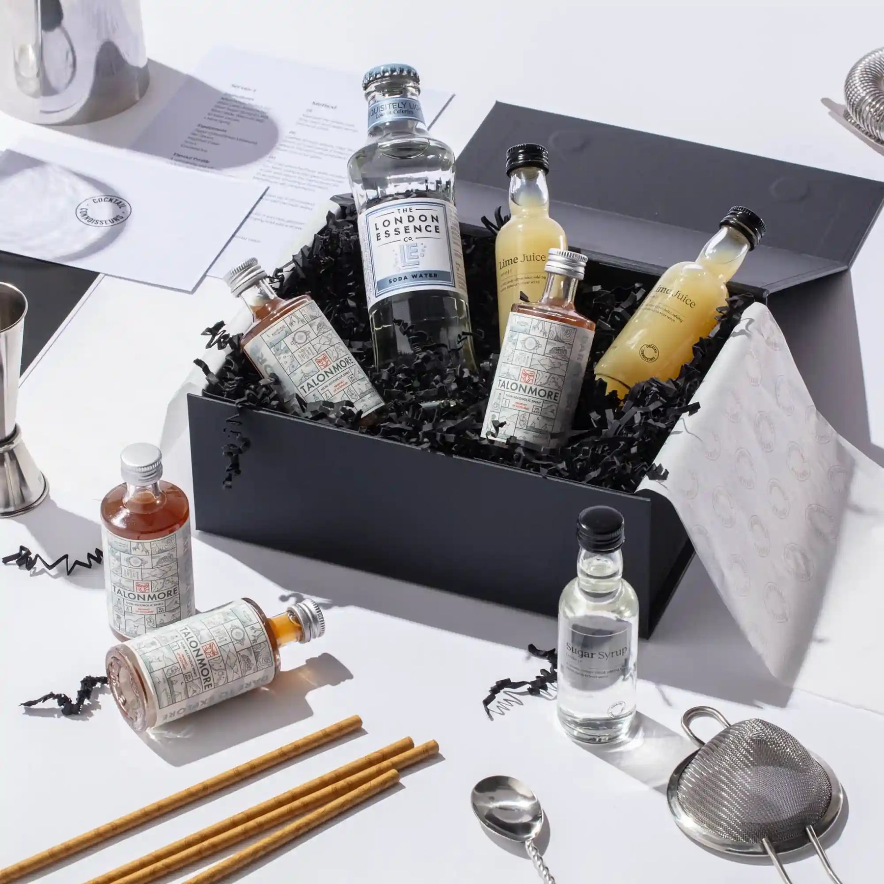 Discover our non-alcoholic Fiery Ginger Mojito cocktail making kit, the perfect gift set for cocktail enthusiasts. Craft 4 bar-quality cocktails at home with premium non-alcoholic spirits, mixers, syrups, juices, garnishes, recipe cards and tutorial videos - all packaged in an elegant presentation box and delivered to your doorstep. Elevate your experience by choosing our 2-in-1 cocktail kit with bar equipment sets. Order your non-alcoholic Fiery Ginger Mojito cocktail kit today!
