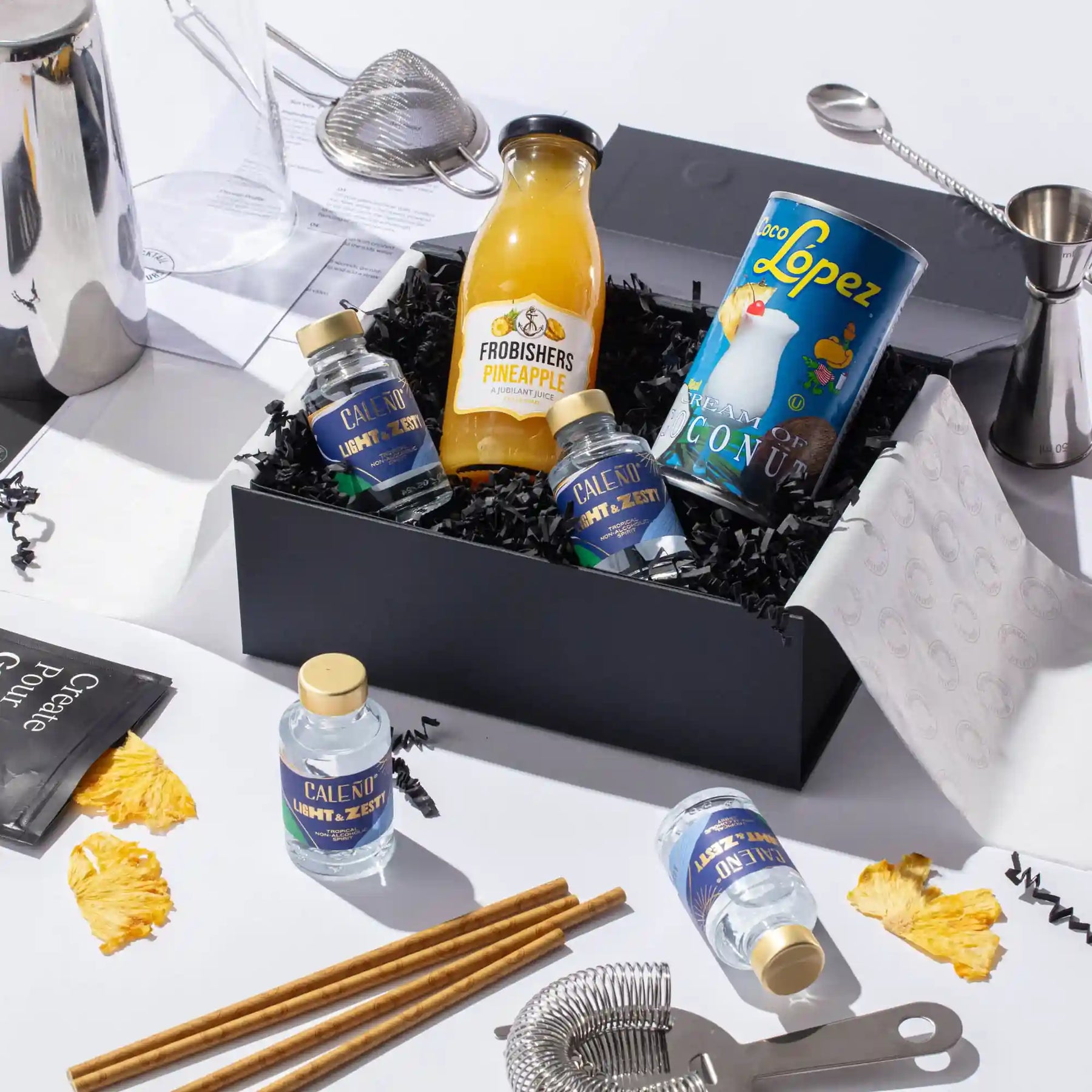 Discover our non-alcoholic Piña Colada cocktail making kit, the perfect gift set for cocktail enthusiasts. Craft 4 bar-quality cocktails at home with premium non-alcoholic spirits, mixers, syrups, juices, garnishes, recipe cards and tutorial videos - all packaged in an elegant presentation box and delivered to your doorstep. Elevate your experience by choosing our 2-in-1 cocktail kit with bar equipment sets. Order your non-alcoholic Piña Colada cocktail kit today!