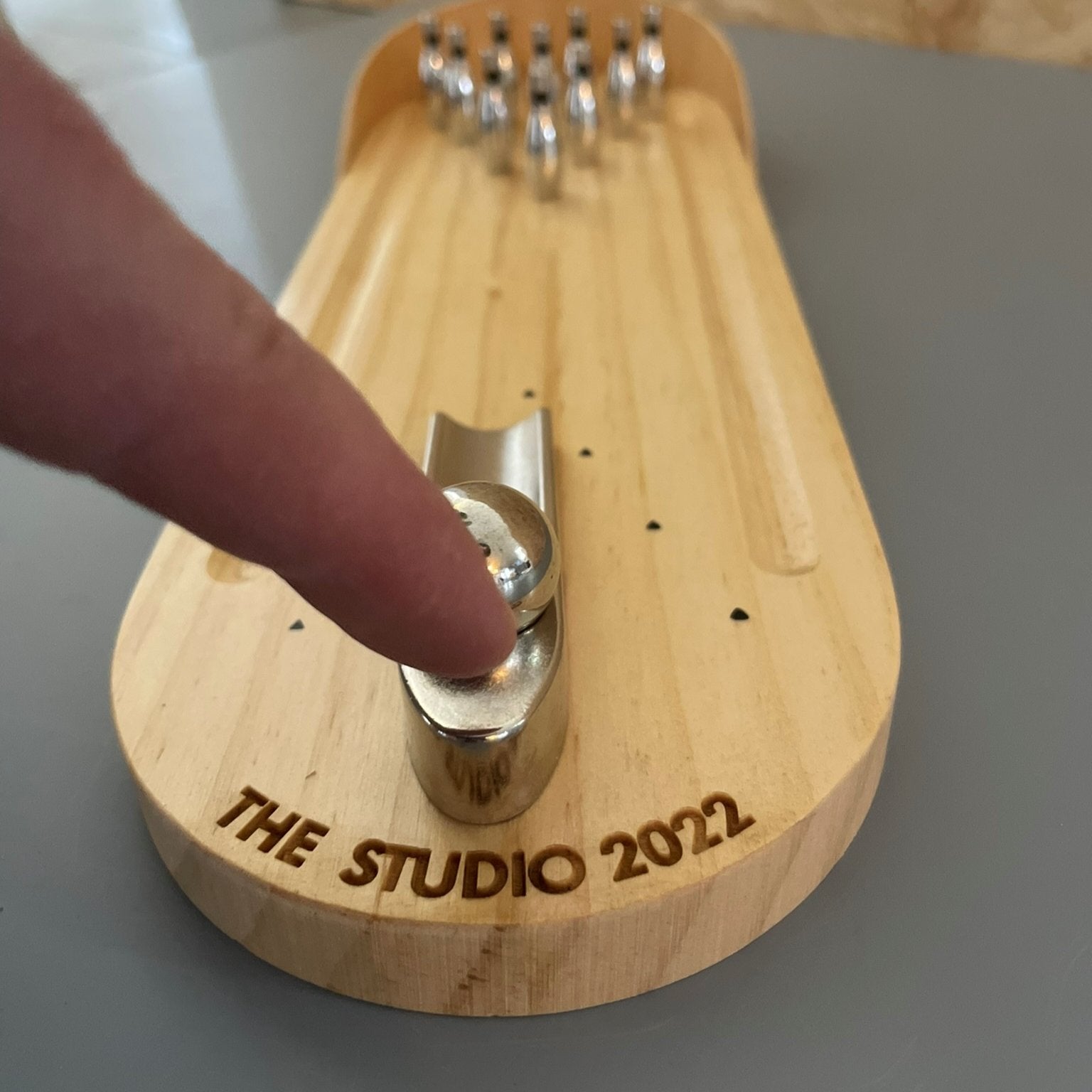Consider yourself a kingpin, hey? Prove it with our Personalised Miniature Bowling Game! We think every office, workplace, and home should have one of these little beauties, perfect for settling disagreements, deciding strategies, and, of course, gives bragging rights to the true bowling extraordinaire! Our mini game comprises an attractive wooden alley, ten metal pins, and the ball and slide ready for you to master. Make that alley truly your own with our choice of personalisation. See our examples for inspiration then write your message in the box provided at checkout. Strike!