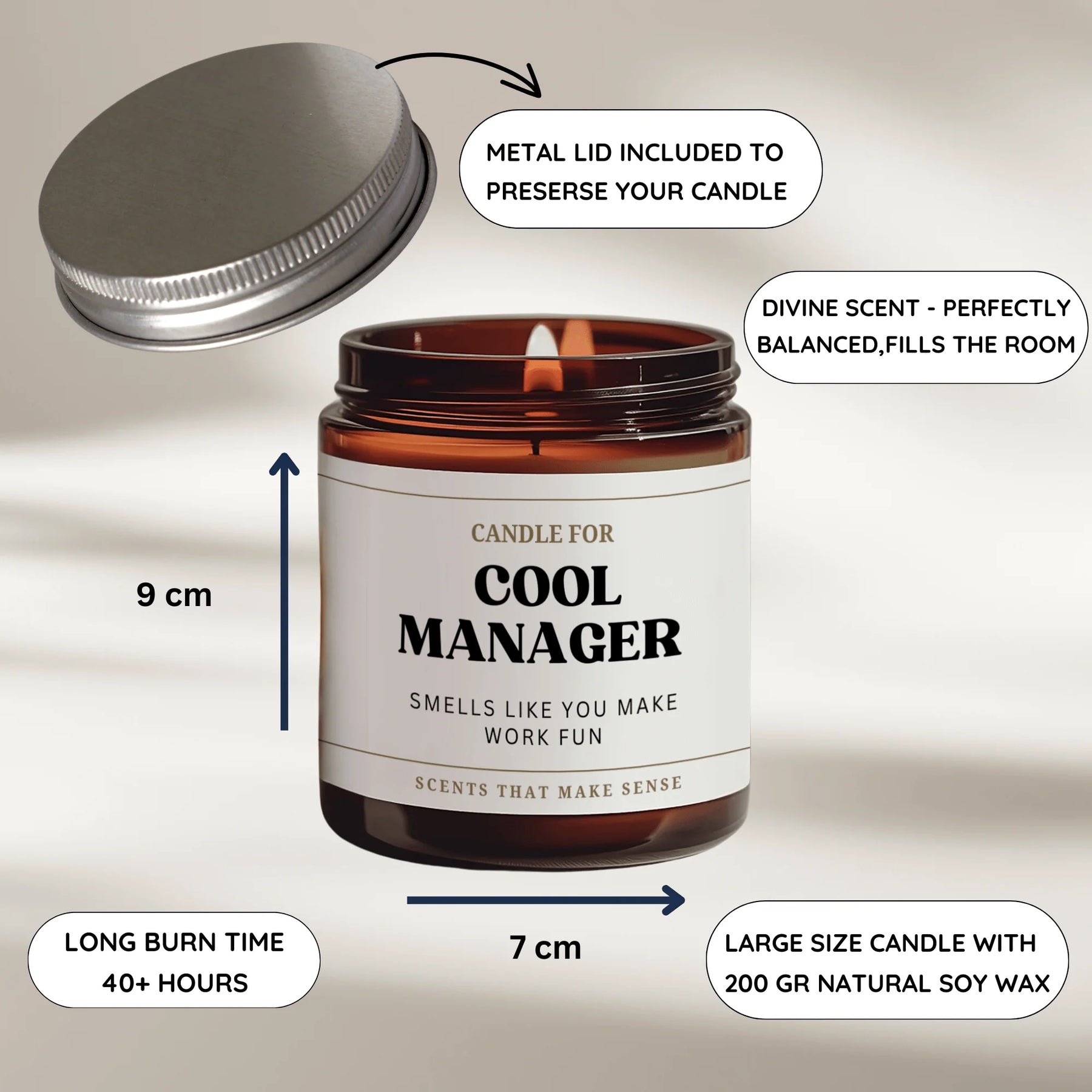 Brighten up any office with our "Cool Manager" candle! This scent captures the essence of great leadership and office cheer, perfect for celebrating promotions, new job, work anniversaries, or just showing appreciation.