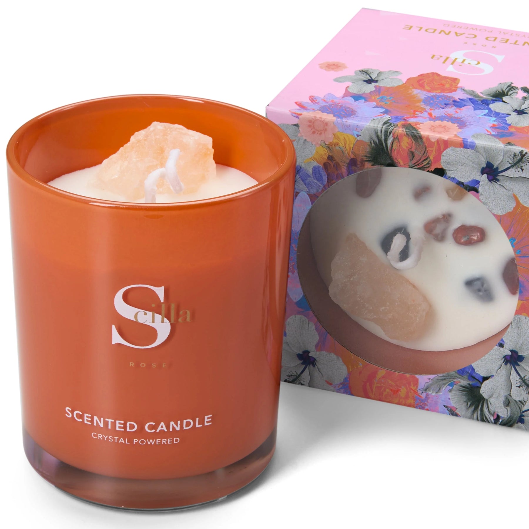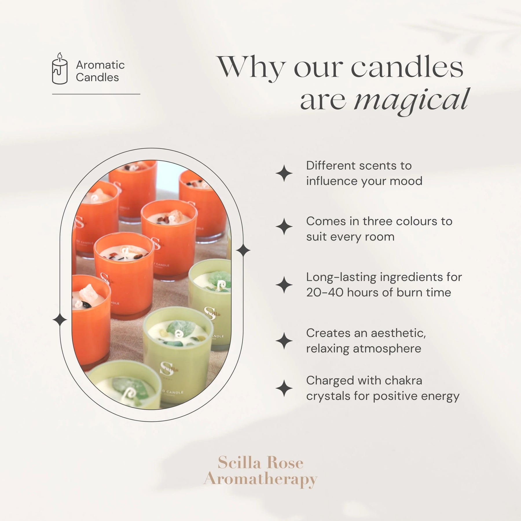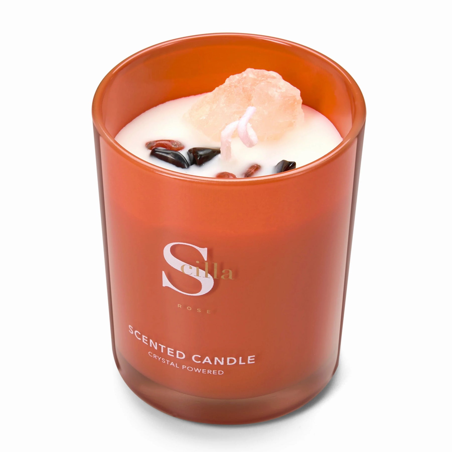 ✨Unwind, chill, and embrace the relaxing and calming fragrance of the Scilla Rose 100% natural soy wax, the "glowing" glass jar candle with Himalayan salt stone, Black and Red Agate crystals, and a blend of natural calming essential oils. Feel free to collect the gemstones after fully consumed and continue to enjoy the crystal-powered benefits.