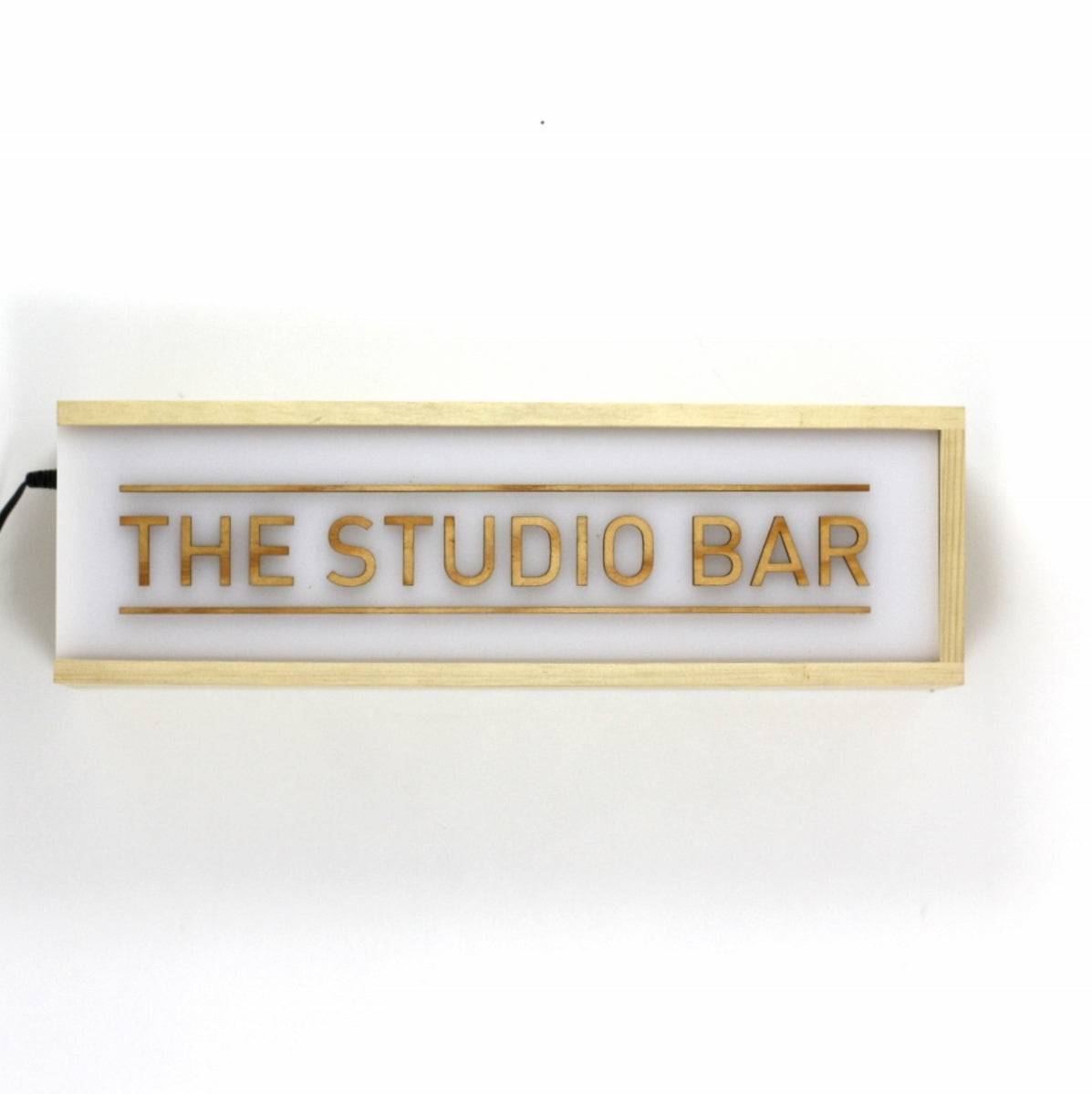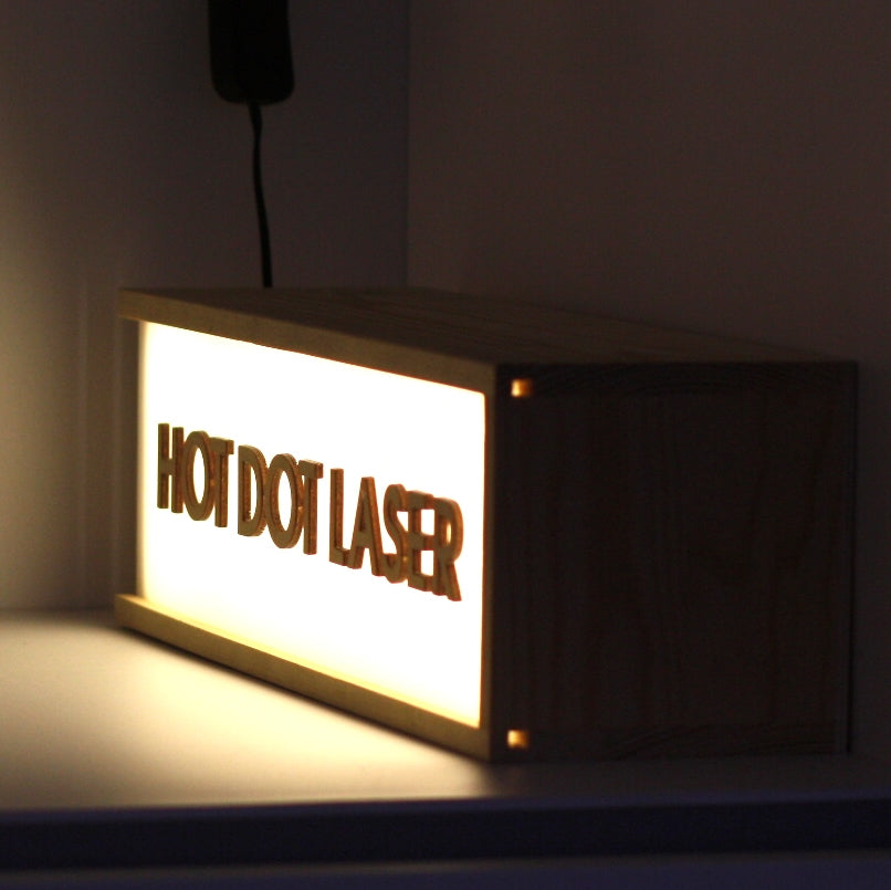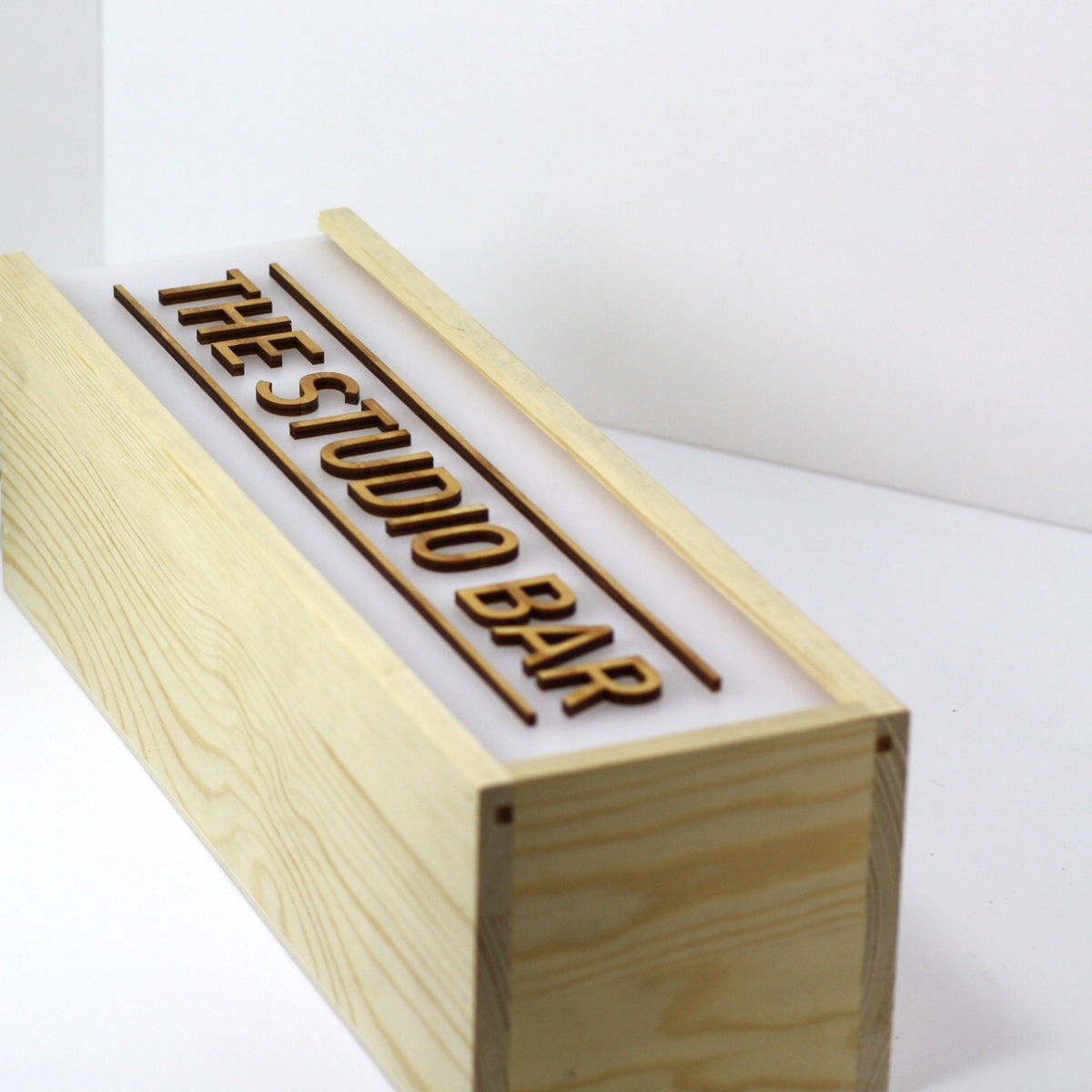 Introducing our Personalised LED LightBox, the perfect illuminated sign for your home. Ideal for adding a personalised touch to your home bar, child’s room, bedroom, or mantle piece, these wooden light boxes are sure to captivate your visitors. Each light box includes a set of LED lights and cable management holes for easy setup. You can customise the wording on the front and select additional lines for a unique touch. Made from soft wood with a frosted acrylic diffuser and 3mm plywood letters, these light boxes are both charming and durable. Size: W35 x H11 x D10cm.